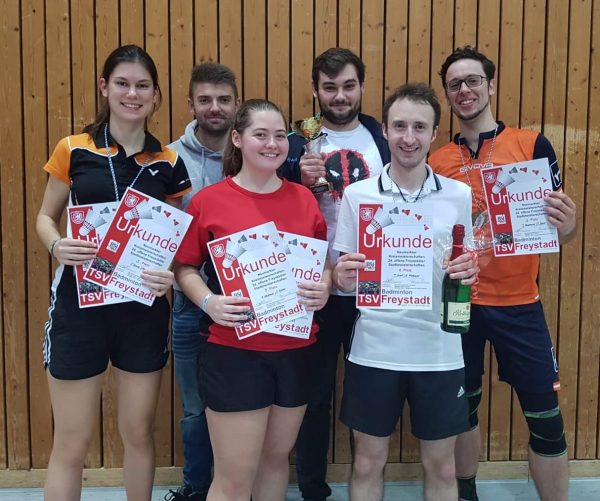 Bericht von T. Graf: Am Samstag den 29.12.2018 folgten sechs unserer Badmintonspieler der Einladung zur Freystädter Stadtmeisterschaft. Dazu hieß es früh aufstehen um pünktlich, trotz längerer Anreise ans Ziel zu kommen. Mit dabei waren Kerstin Käsbauer, Sophia Dinter, Korbinian Duscher, Stefan Pirzer, Jochen Feldmeier und Tobias Graf. Als man dann um kurz vor neun Uhr ankam war schon einiges los auf den Feldern und man spielte sich zusammen für die bevorstehenden Aufgaben ein.